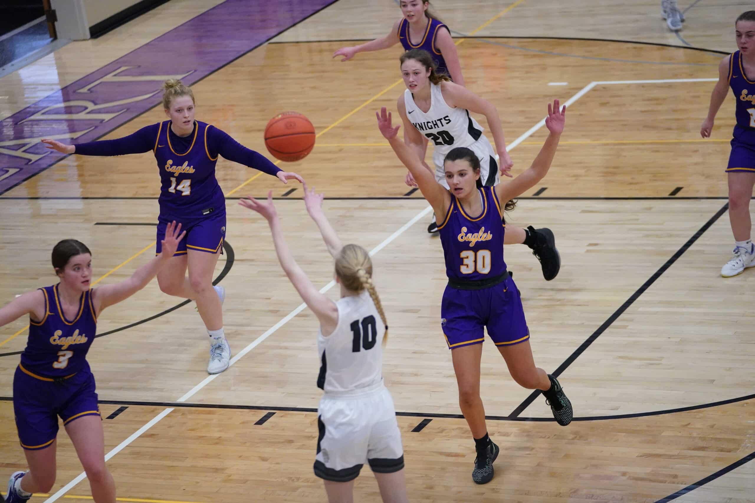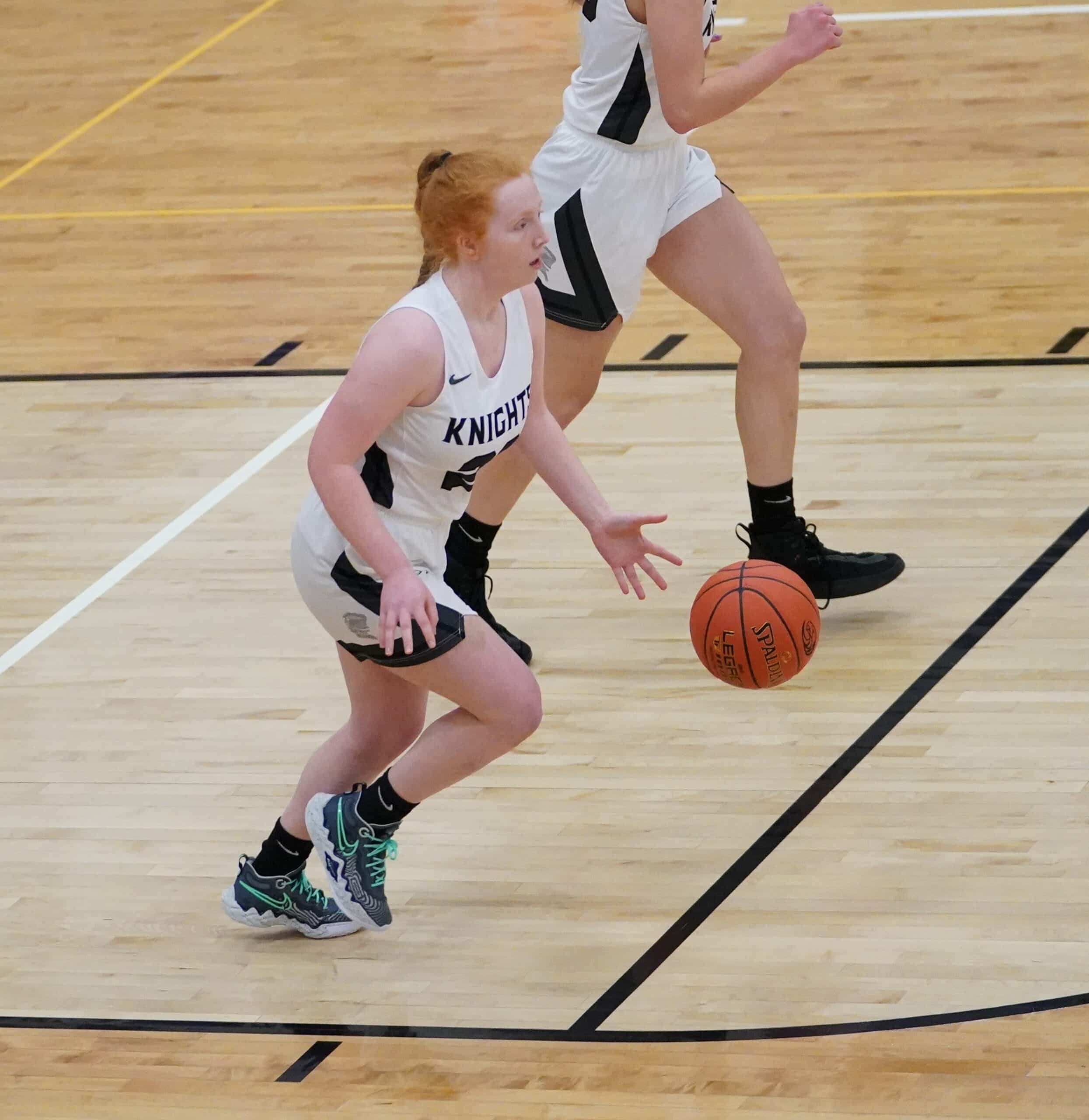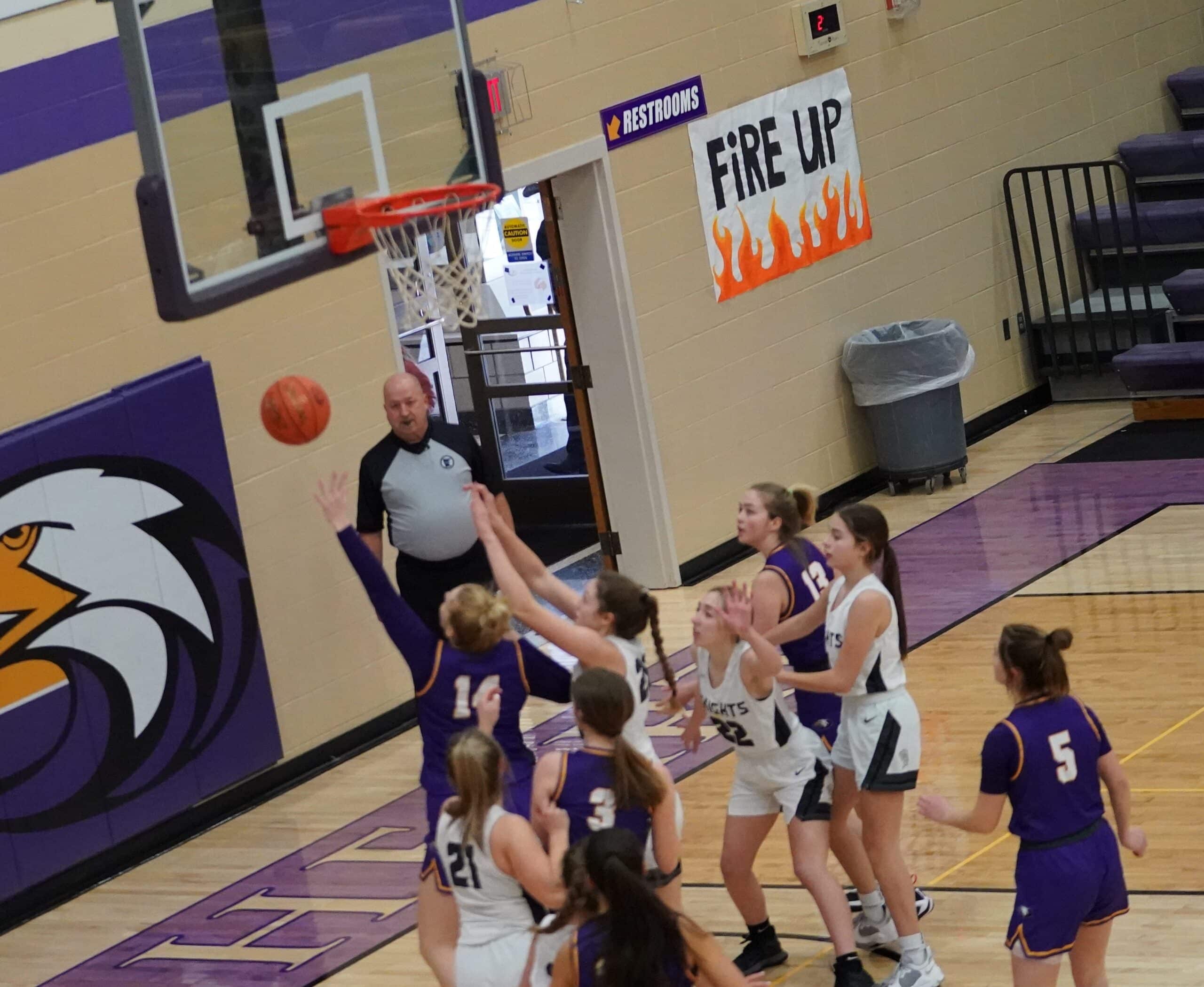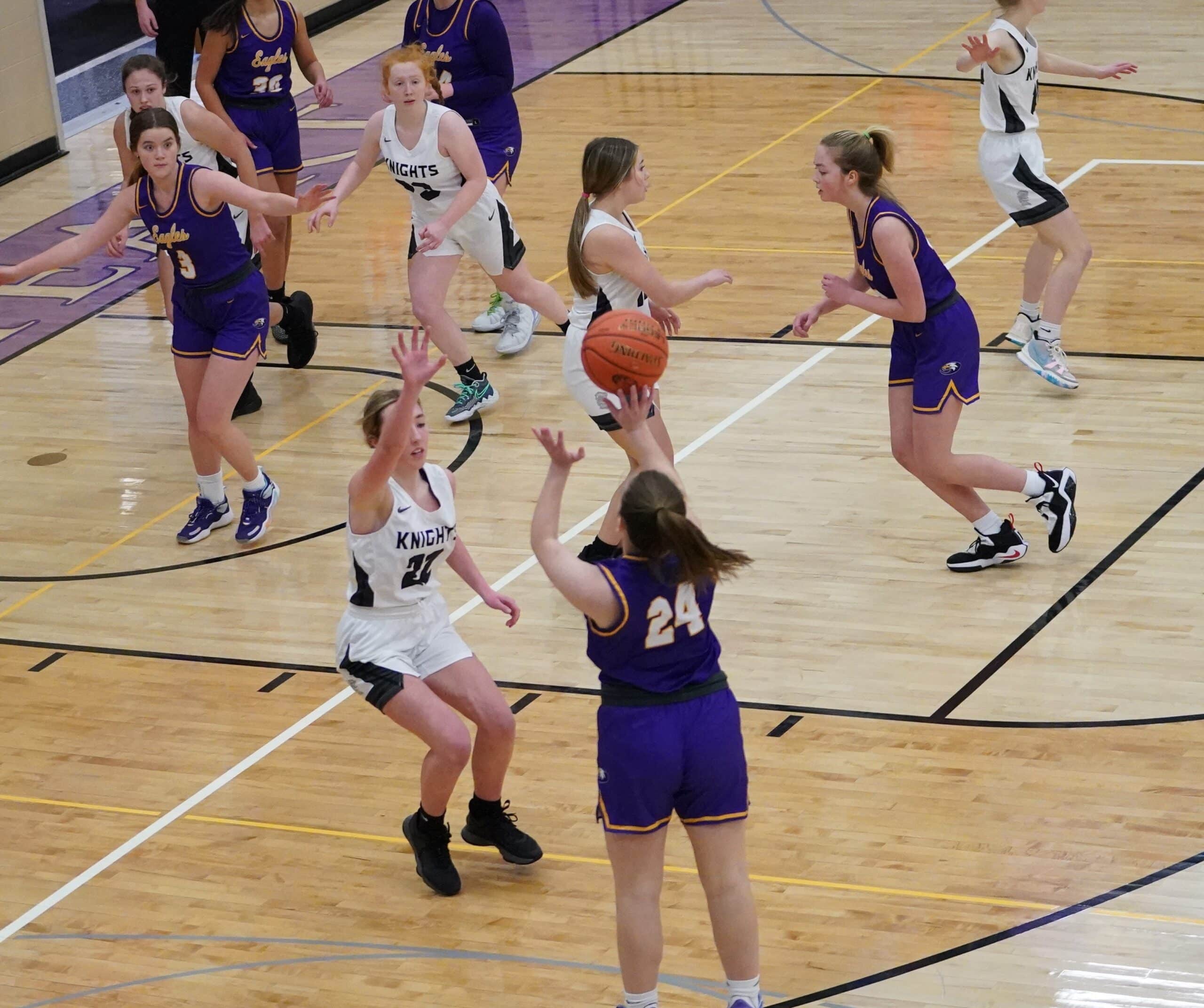 Both teams struggled to score early before Halle Reitmeier provided the first four points of the game to give the Knights a 4-0 lead. Isabel Vonesh answered with a three-pointer for the Eagles, and after a 6-0 run from the Knights, the score was 10-3 Climax-Fisher with 10:00 remaining in the first half. The Eagles would respond and go on a 6-0 run of their own to pull within 1 point of the Knights at 10-9. Four of the points during the run were free throws from Ava Knudson, and Reese Chwialkowski. The Knights would then end the half on a 9-0 run to take a 19-9 lead into the halftime break. The run was highlighted by two baskets from Claire Erickson, and a few free-throws from Trinity Erickson. The Knights were led by Halle Reitmeier in the first half with 6 points, while the Eagles were led by Isabel Vonesh with 3 points. “The first half we struggled at times moving the basketball,” said Knights Coach Adrianna Rooney. “Once the girls figured out we could be patient and move the basketball around, we had a lot of success.”