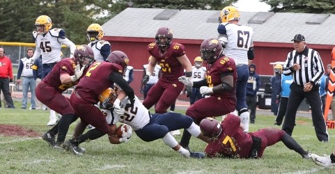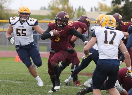Minnesota Crookston’s next drive ended with a three-and-out with a 47-yard Stephen Day punt pinning Augustana to their own 28-yard line. The Vikings responded on their next possession with a 35-yard pass from Saddler to Drew Reinschmidt who sprinted down the Minnesota Crookston sideline to the UMC 37-yard line. Two plays later, Saddler hit Shahan Ameen for 10 more yards before ending the drive with a second straight touchdown pass to Sean Engel for 27-yards and a 28-0 Augustana lead with 11:10 left in the first half.