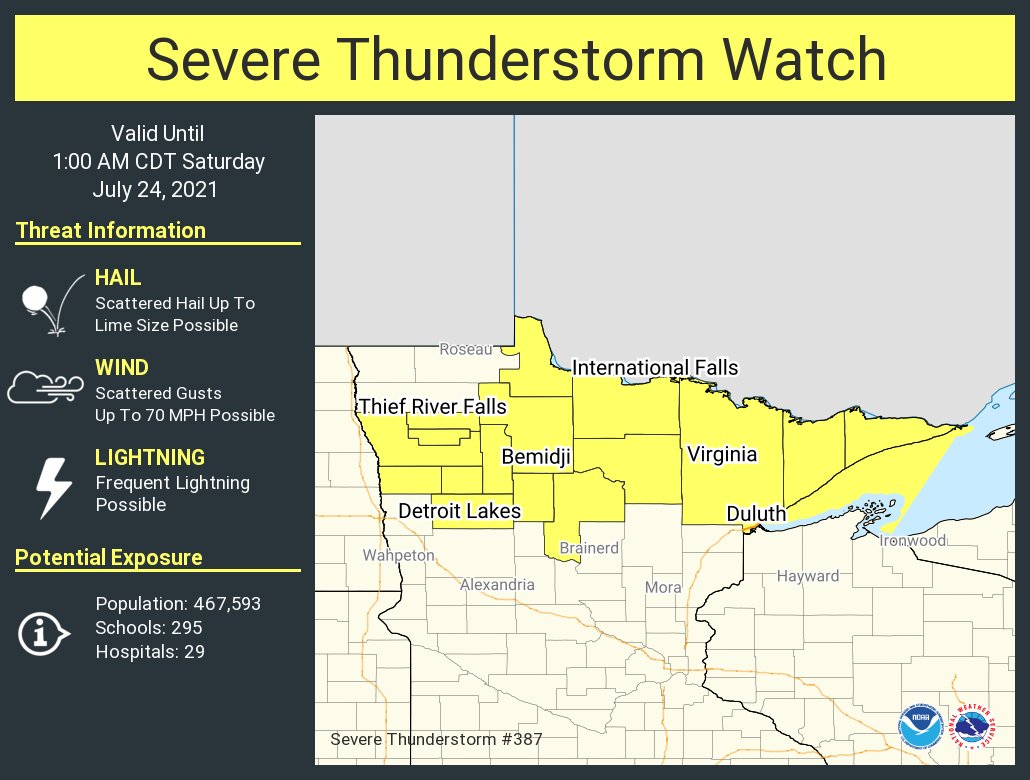 The National Weather Service Storm Prediction Center in Norman, Oklahoma has issued a Severe Thunderstorm Watch for Northern Minnesota until 1:00 a.m. Saturday, July 24.