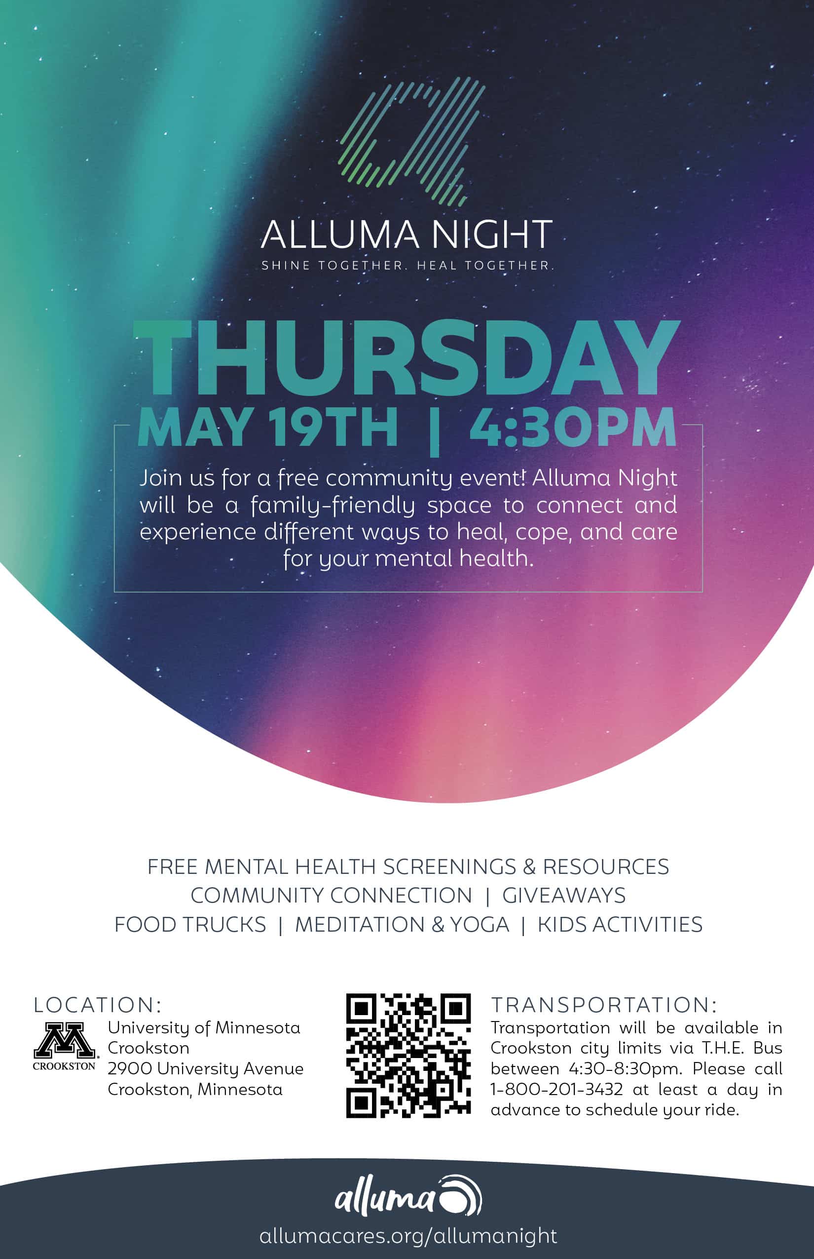 “Overcoming mental and chemical health challenges can feel overwhelming and impossible,” says Reitmeier. “We believe relationships and social connections are essential to healing, recovery, and overall wellbeing.” Alluma will offer free mental health screenings and resources during the event. Swag bags will be available while supplies last. The event is free of charge and open to the public. Transportation will be available in Crookston city limits via T.H.E. Bus between 4:30-8:30 p.m.