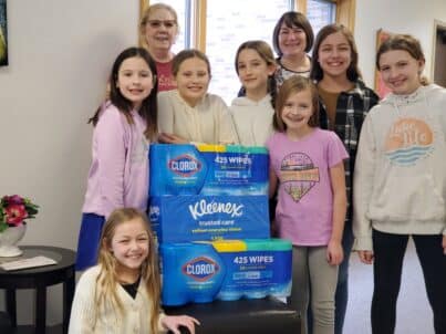 Chaplain Elaine Metzger presented a donation of multiple packs of tissues and sanitizing wipes to Our Savior’s Lutheran School.