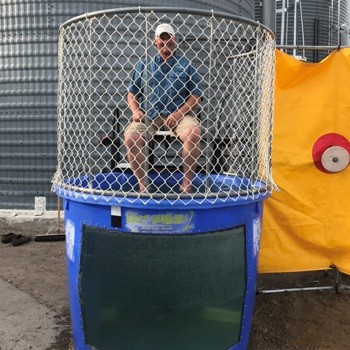 Tom Rongen said AgriMAX made a dunk tank for their recent research plot tours. The farmers got to dunk their favorite salesman, adding Tom Conati was the preferred target. “Every year we do a tour of our research plots at AgriMAX,” said Rongen.  “We get a lot of customers, 250 to 300 people, come to that.  And we always thought that there was a better way to help the United Way.  So we came up with a dunk tank – Dunk Your Favorite Salesman – and all the salespeople from AgriMAX were volunteering to have the farmers throw softballs at them.”