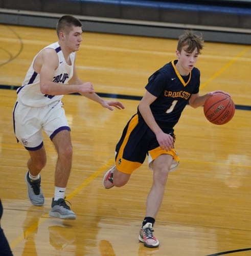 Crookston started the game by winning the tip and scoring the first four points of the game with two free throws from Jack Garmen and a basket from Jacob Hesby. Barnesville answered with back-to-back three-pointers from Logan Ernst and Tate Inniger for a 6-4 lead. Crookston tied the game at six with a Hesby basket and after two Barnesville free throws, Hesby buried a three-pointer for a 9-8 lead. Barnesville’s Kaden ZenZen (an NDSU football recruit) scored before Crookston’s Hesby answered with another basket to give the Pirates an 11-10 lead with 12 minutes left in the half. Hesby had nine of the Pirate’s 11 points. “He came out shooting well,” said Pirate Coach Greg Garmen. “He was aggressive and was getting some rebounds for us and did a nice job, especially early.” Barnesville answered with four straight points before Hunter Nicholas made a three-pointer to tie the game at 14. Barnesville responded with a 7-0 run and continued to build on their lead and had a 26-18 lead with 6:05 left in the half. Crookston’s Ryan Abeld made a three-pointer, followed by a Reggie Winjum layup, and a Haden Michaelson free throw to get within a 26-24 deficit with four minutes left. Barnesville dominated the rest of the half and finished on a 12-3 run while turning Pirate turnovers into points for a 28-27 lead at halftime. “That late run hurt us,” said Coach Garmen. “We turned the ball over too many times late and that seemed to get them going at the end of the half.”