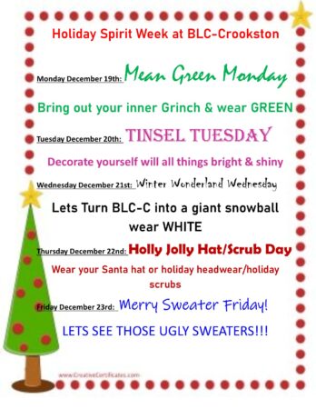 The Benedictine Living Community-Crookston’s Holiday Spirit Week begins on Monday and will have holiday themes throughout the week of December 19-23. Stay tuned to KROX’s Bulletin Board to learn the theme for each day. A poster for the spirit week can be seen below.