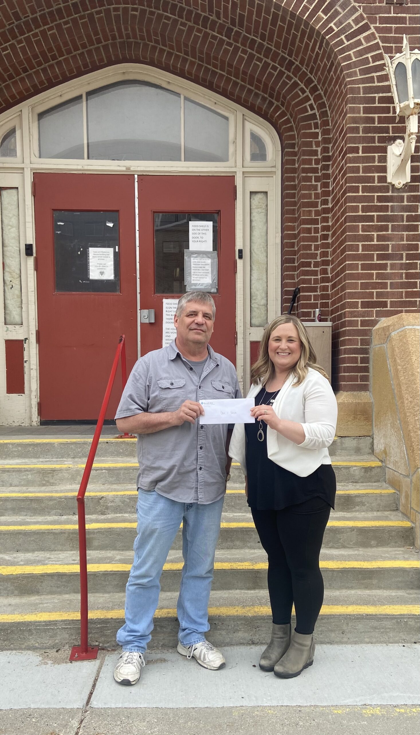 Benedictine Living Community Foundation Development Director Cassie Rudie presented Care and Share Director Brian Halos with a gift from the Community’s annual food and cash drive. Community Partnership at its finest!
