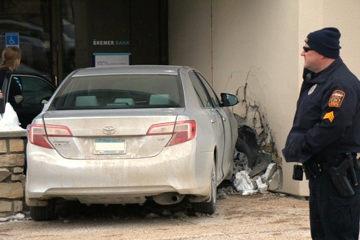On Thursday, February 6 at 1:37 p.m., the Crookston Police Department responded to the report of an accident at Bremer Bank.  The vehicle was a 2012 Toyota Camry driven by Rovella Weiland of Euclid.  There were no injuries or citations.  There was severe damage to the vehicle and building.