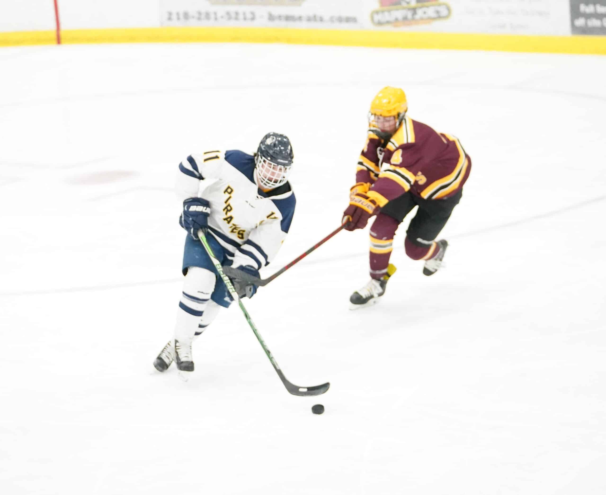 It was an extremely physical game right from the start, with both teams playing hard from the opening drop of the puck. Jack Doda got the scoring started for the Pirates, as he received a pass at the blue line and just threw it on the net to beat the goalie, giving the Pirates an early 1-0 lead. The Flyers wasted no time responding, scoring another strange goal on a bouncing puck to tie the game at 1-1 less than four minutes into the game. The teams traded a few shots, and at the 9:21 mark, the Flyers would snag their first lead of the game on a goal from Logan Merschman. “We weren’t great in the first period,” said Pirates Head Coach Josh Hardy. “I thought we dug ourselves in a hole tonight, and the biggest difference tonight was we showed a lot of heart and effort later in the game to come back.” Each team would have a couple of chances on the Power Play but would be unsuccessful, and Bagley-Fosston would take a 2-1 lead into the second period. The Flyers outshot the Pirates 9-5 in the first period.