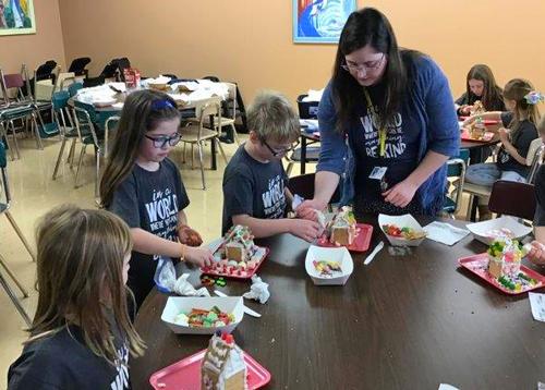 Cathedral School 1st and 3rd-grade buddies spent Friday afternoon constructing gingerbread houses! Parents and Grandparents joined in the fun to create a variety of different models! Third-grade teacher, Samantha Isack, is shown assisting a group of children.