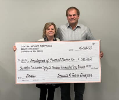 The square footage and the workforce aren’t the only things growing at Central Boiler Companies. So is the size of the bonus distribution. The company celebrated the 30th consecutive year of bonus distribution on October 28 at their Greenbush facility. The bonus, along with the company’s contributions to the employee 401K accounts, totaled $1,586,562.58. The company matched up to 15% of employees’’ contributions to their 401K accounts from their bonuses. This celebration marks the company’s 38th year of existence and continued growth for all three subsidiaries: Central Boiler, Inc., Altoz, Inc., and WoodMaster, Inc.