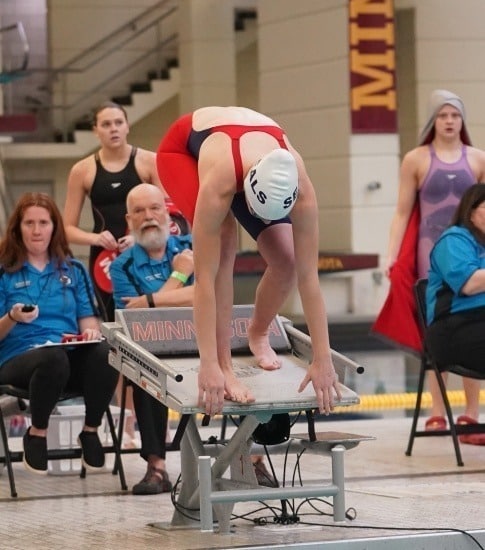 The Fosston/Bagley/Crookston Seal swim team’s Chloe Boll competed in two events at the Minnesota State Swimming and Diving meet at the University of Minnesota Aquatic Center in Minneapolis. In warm-ups, Chloe banged the back of her foot on the gutter as she turned at the wall, and it instantly left a black and blue mark on her heel. It didn’t stop her from turning in two solid races.