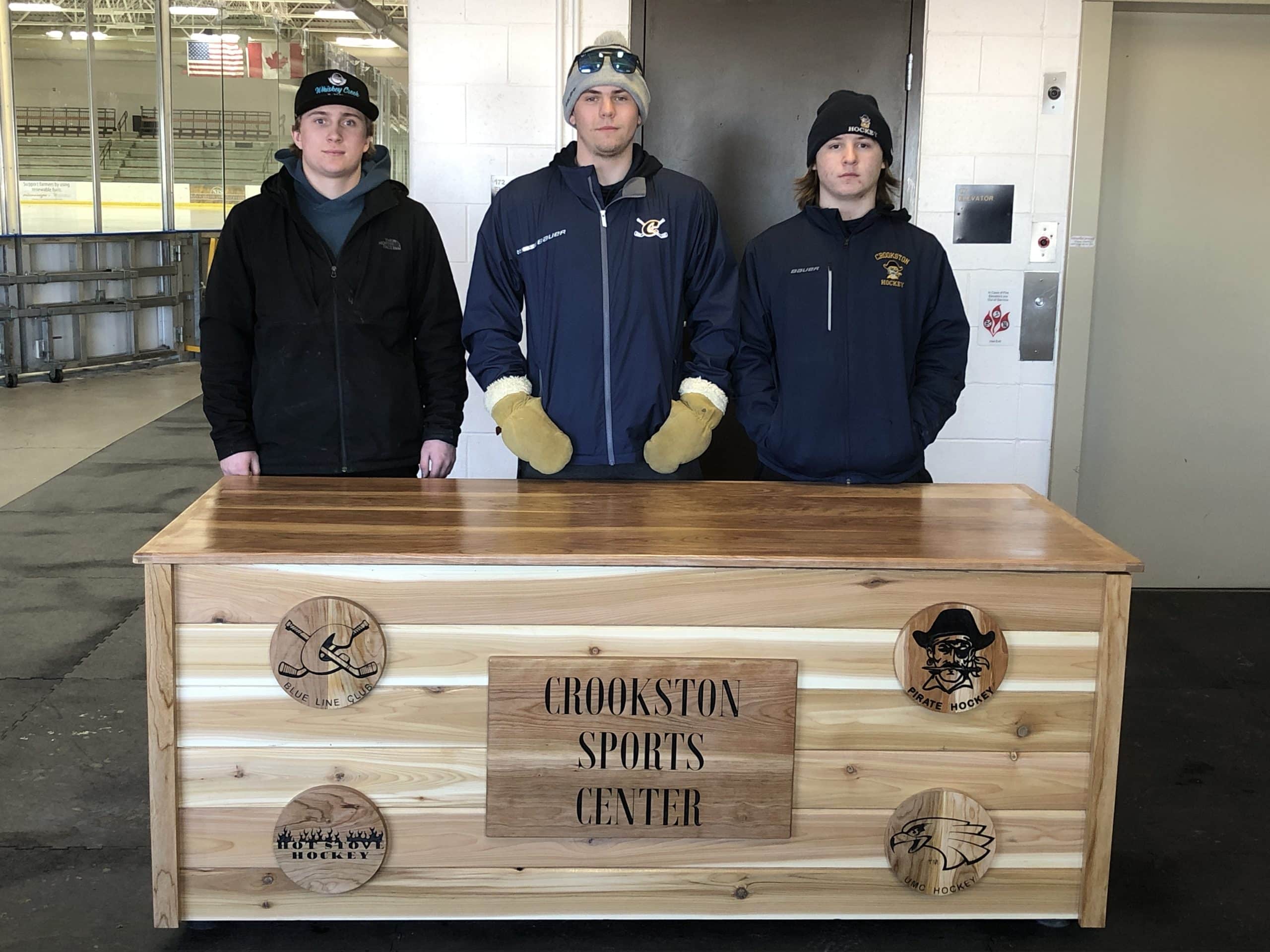 The Crookston High School’s Community Projects class is constantly working to create new projects to help the community and the school, and a team of three students have completed another project to help the school and community. Crookston High School seniors Hunter Knutson, Jaren Bailey, and Jackson Demarais built a new front admissions desk, like the one at the entrance of the High School, for the Crookston Sports Center.