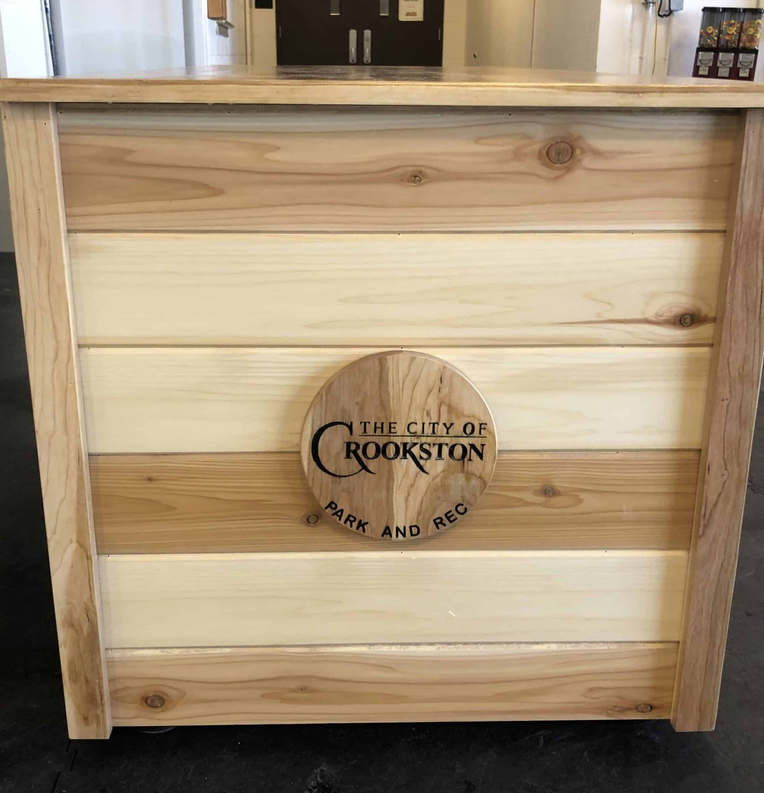 To help fund the creation of the desk, the students asked for donations from other departments and clubs that also use the Sports Center to complete the desk. “I did all the programming for the CNC to cut out the logos of all the businesses that donated money to us for it,” Senior Jackson Demarais explained. “So, we asked if people would donate some money for it, and all of the businesses on here donated $200 each to fund the creation of this table.” To thank the organizations for their contributions, the students created wooden circles with their logos to attach all over the desk. The businesses that contributed money to the creation of the desk included the Crookston Parks & Recreations Department, the Crookston Blue Line Club, the Crookston Figure Skating Association, the University of Minnesota Crookston Athletic Department, the Crookston High School Hockey Team, and Hot Stove Hockey.