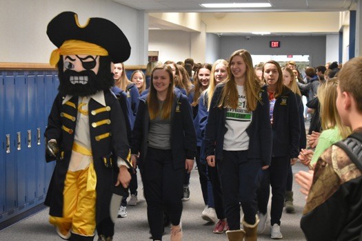 Crookston High School held a sendoff for the Crookston Pirate Girls Basketball team at the end of the school day as the girls get ready to take on the Roseau Rams in tonight’s Section 8AA Championship game at the University of Minnesota Crookston. KROX will have the game on the radio, online by clicking on listen live at the top/right of the website, on the KROX app, or Alexa. (Alexa, listen to KROX in Crookston)