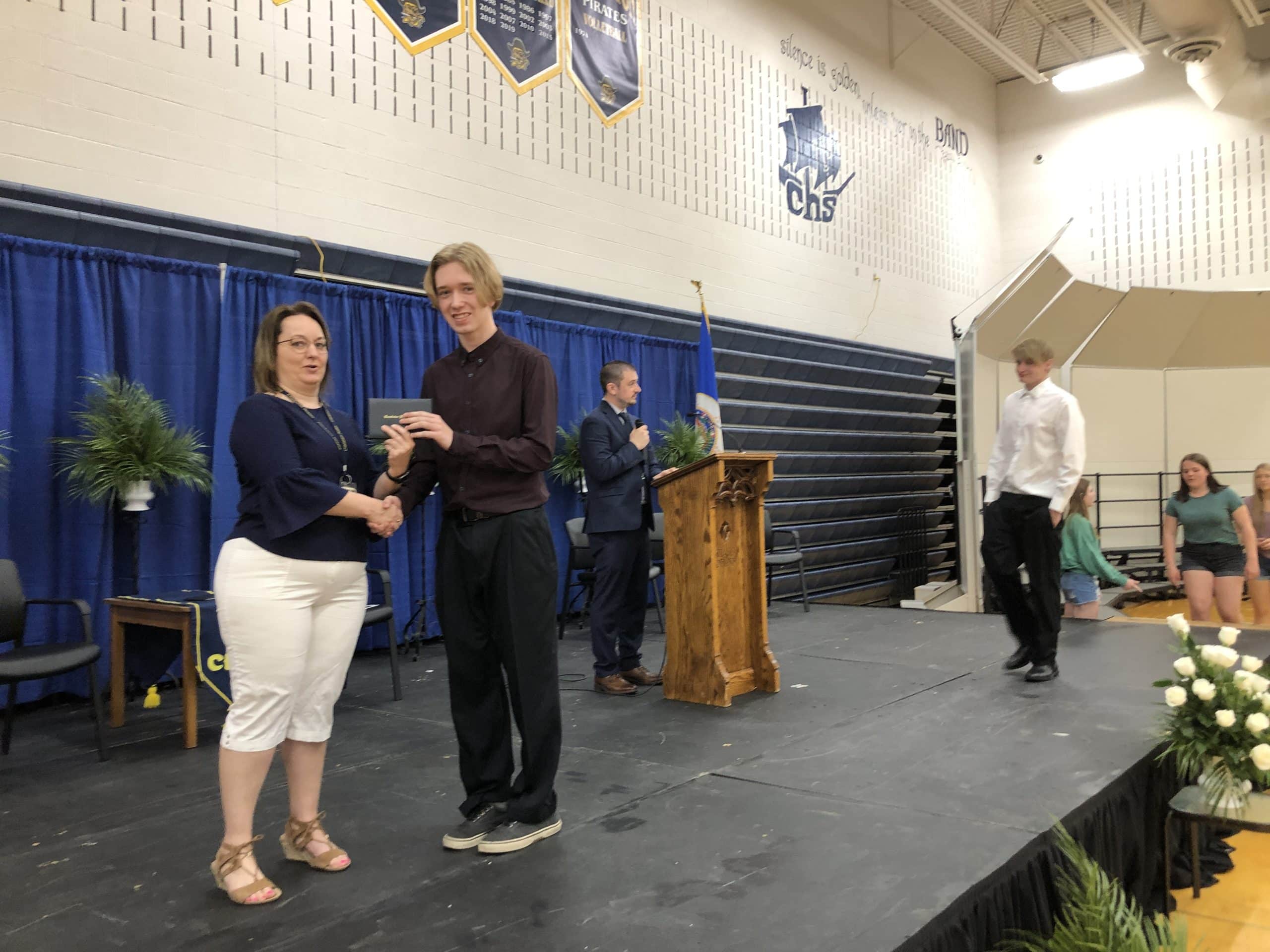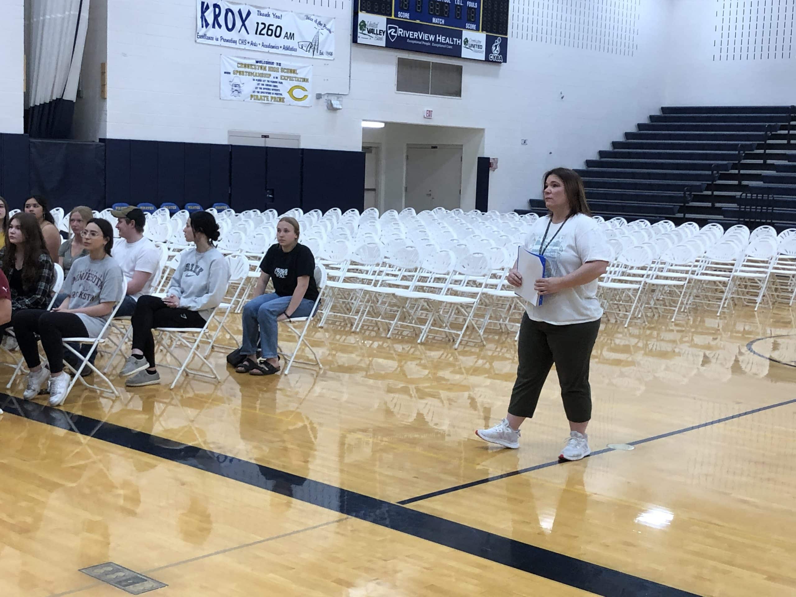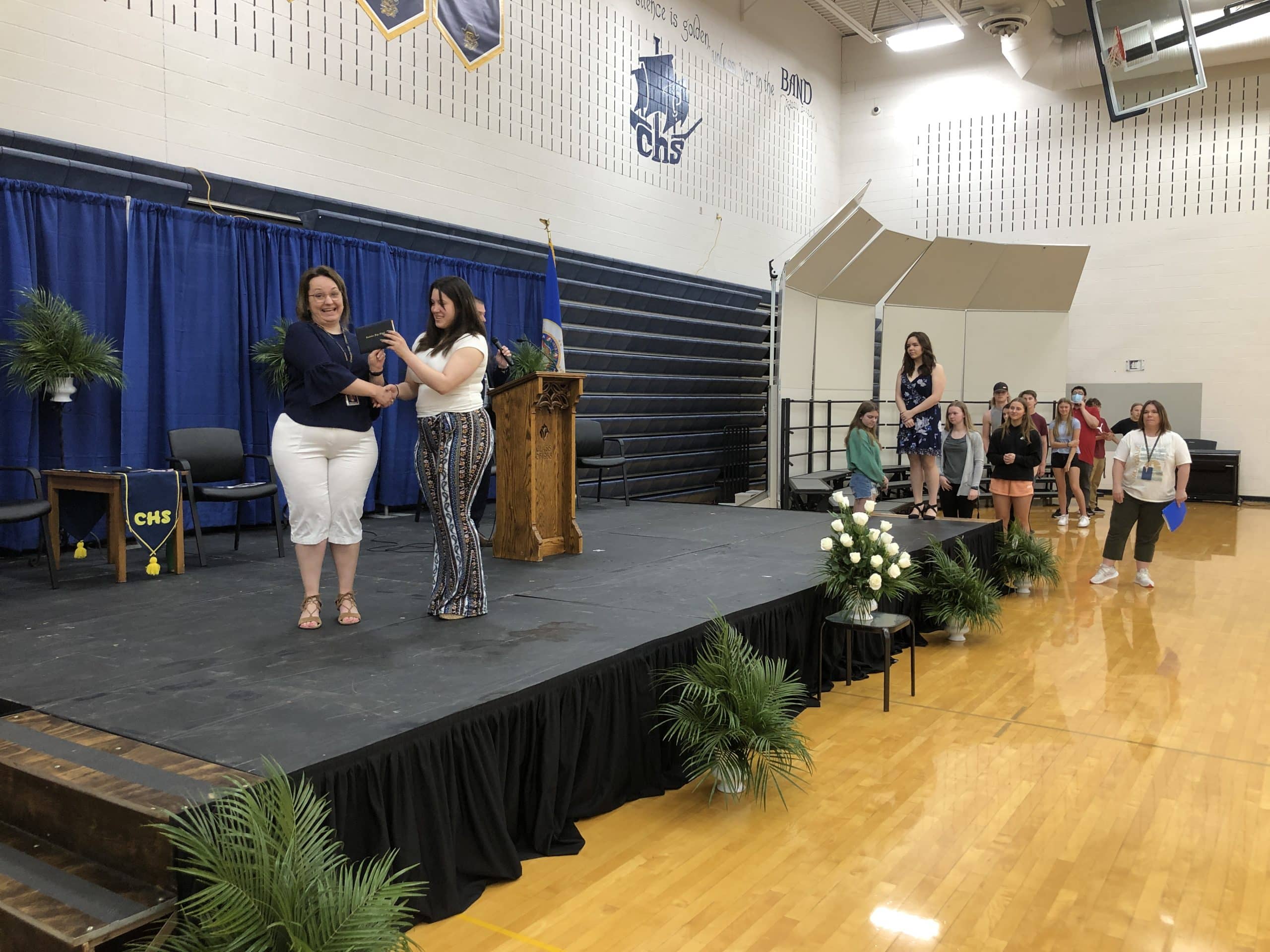 The seniors then returned to the High School, where they went into the School Gymnasium and began rehearsal for their Graduation Ceremony later tonight with School Counselor and Graduation Coordinator Tara Klein. The class practiced their procession and how they would be receiving their diplomas with the CHS Band performing the processional music. After the rehearsal, the students were dismissed for the day.