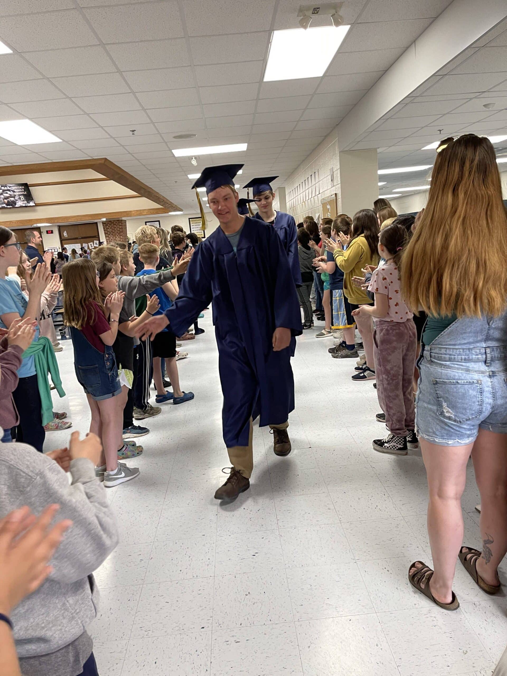 The seniors then put on their caps and gowns and boarded two busses to Washington and Highland Elementary Schools to complete a “Senior Walk.” Where they were met with students lining the halls offering high-fives and well wishes to the older students and, to some, their older siblings.