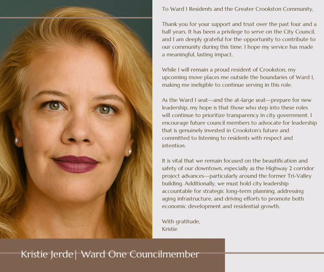 Approved within the consent agenda was approval of the Proposed City Council Minutes from July 7, 2025. Also approved were the City of Crookston Bills and Disbursements for $600,348.23, authorization of a contract with Salas O’Brian North, LLC in the amount of $141,140, with respect to the Woods Addition Geothermal Feasibility Study, Irishman Shanty Inc. of the dispensing of intoxicating liquor on premises at Jim Karn Field during the American Legion Baseball Playoff Tournament July 24-26, 2025, and a contract with Lakes Area Jetting for an amount not to exceed $28,000 to provide cleaning services on Storm Outlet #7 (Gorgas and West Robert).