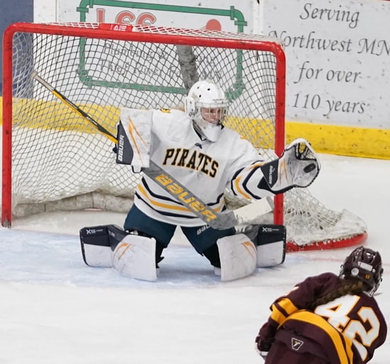 The Crookston Pirates junior Kaylie Clauson scored on a rebound with just under seven minutes left in the game to give the Pirates, ranked #9 in the Minnesota Class A polls, a 2-1 win over Fergus Falls at the Ralph Engelstad Arena Holiday Classic in Thief River Falls.