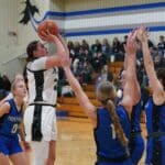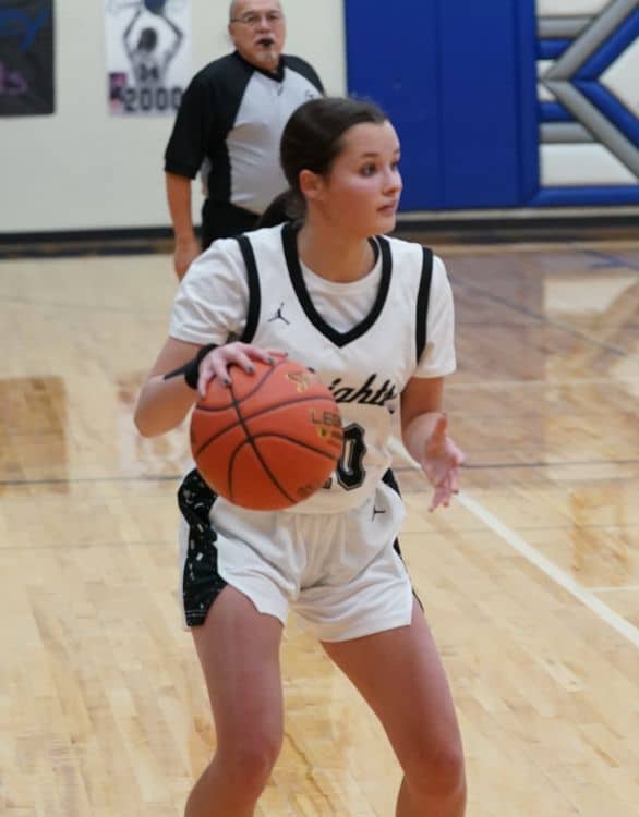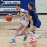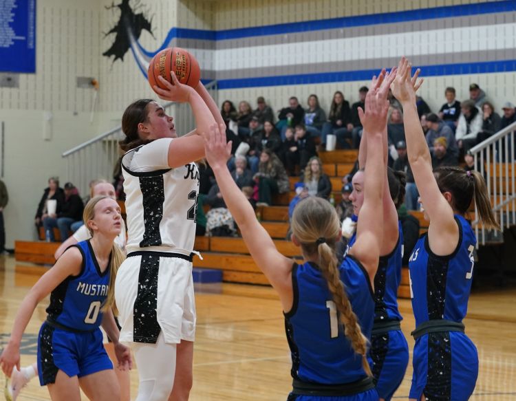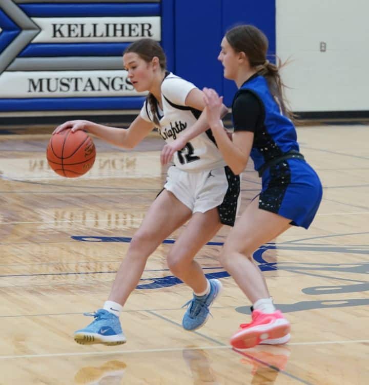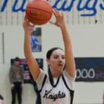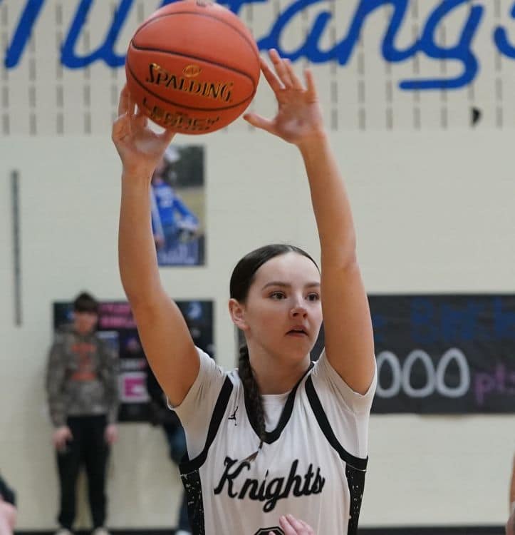 After the Knights scored first, the next two buckets were from the Mustangs’ Kylee Binkley, with the second one getting her to 2,000 points for her career. The Mustangs’ defense could do what they wanted with the offense of the Knights, as they forced 16 turnovers in the first half. The star player for the Knights was Peyton Hoffman, who scored 19 points, while the rest of the team had 15 in the half. The other 12 points came from Lucy Paulsrud, who hit 4 threes, and Kadence Korynta, who hit a three of her own. Overall, however, the Mustangs were in control. They consistently doubled up the Knights, from 34-17, to 44-22, all the way to 52-26. After the Knights went on an 8-0 run to cut the lead to 18 at 52-34, the Mustangs went on a 7-0 run to end the half, taking a 59-34 lead into halftime.