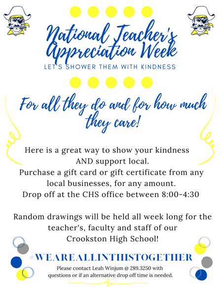 This week is National Teachers Appreciation week parents of Crookston High School Students, and community members are being asked to purchase gift cards/certificates of any amount from local businesses and bring them to the high school. They will be distributed randomly throughout the week to Crookston High School staff and faculty. Not only is it a way to give a gift to a teacher, but to help out the local businesses. SUPPORT LOCAL & APPRECIATE TEACHERS/FACULTY/STAFF. More information is below.
