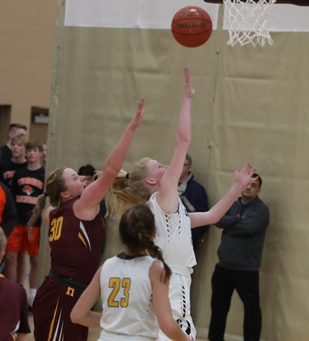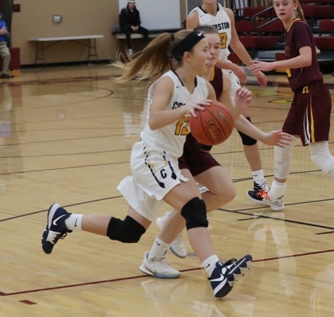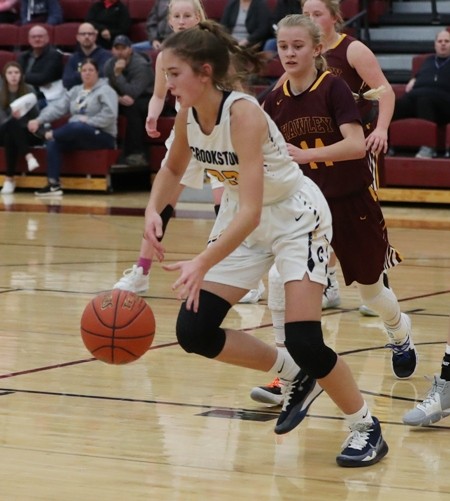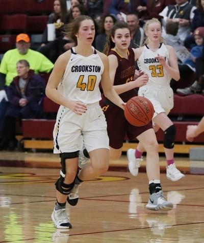 Hawley had the hot hand early while making their first three three-point attempts to lead 9-5 over three minutes into the game. Kylie Crabtree made two of the three-pointers while Paige Thompson made one. Hawley took their biggest lead of the game after a Kylie Crabtree basket for an 11-6 lead. “They came out and shot the ball very well at the beginning of the game,” said Coach Zimmerman. “We weren’t playing bad, they just shot the ball well.” Crookston trailed 16-12 with six minutes left in the half when they started to pick up their defensive pressure and that led to a 5-0 run with a Hayden Winjum free throw, an Emma Borowicz layup and a Hayden Winjum steal and layup for a 17-16 lead, the first of the game for Crookston. Hawley answered with a Paige Thompson basket before Crookston went on a 5-0 run with two Gretchen Theis free throws and an Emma Borowicz three-pointer for a 22-18 lead with 2:30 left in the half. “I thought that was our best stretch of the game,” said Coach Zimmerman. “We got some steals, some run-outs and we had a little extra bounce in our step.” The teams exchanged baskets the rest of the half and Hawley took a 26-24 lead into halftime. “We played a pretty good first half,” said Coach Zimmerman. “Both teams played good defense and they made a play or two more than we did.”