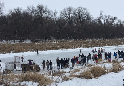 On Sunday, December 23 Crookston girls hockey players were invited to the third annual outdoor/pond hockey skate on Aunt Polly’s Slough. This year, the Crookston 8U team hosted the Red Lake Falls 8U team on the slough. It was a day of fun, filled with a scrimmage, skating on the two rinks, watching the homemade Zamboni, sledding, warming up by the fires, snacking, and skating on the ice trail that was made on the slough! Mickey Kaiser and Tim Perrson have coached the girls 8U program for several years and most of the 8U-12U girls have had them as a coach at one point. They and their families put a lot of time and work into this event by making rinks and skating trails, making a large windbreak with benches and a table full of food, hauling benches and nets. Food was provided for the event by Tim and Mickey, and Brent Epema of B&E Meats brings his grill and serves hot dogs, brats, and burgers. Scott and Tom McDonald made the Zamboni for the event. The Crookston Fire Department delivered water to fill the Zamboni. Some pictures from the event are below.