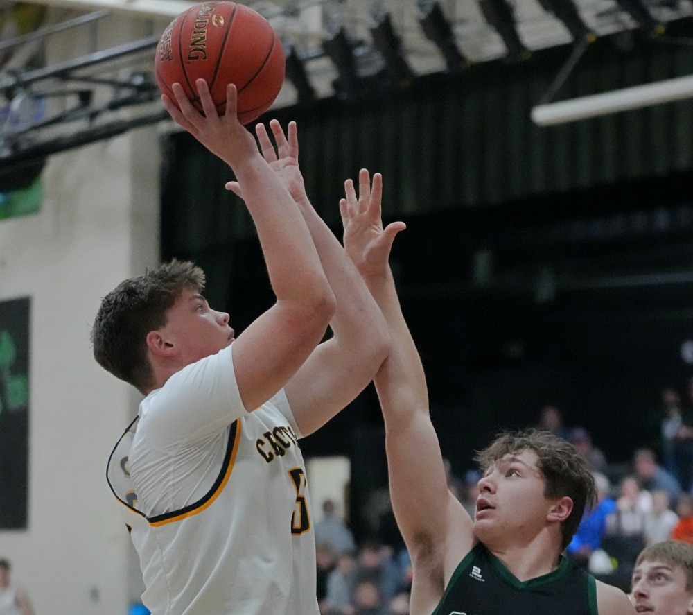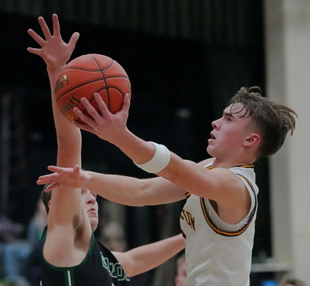 The Badger/Greenbush-Middle River Gators Payton Gust grabbed an offensive rebound and scored with 5.4 seconds remaining to give his team a 53-51 victory over the Crookston Pirate Boys Basketball team in the Swamp at the Greenbush-Middle River High School gymnasium.