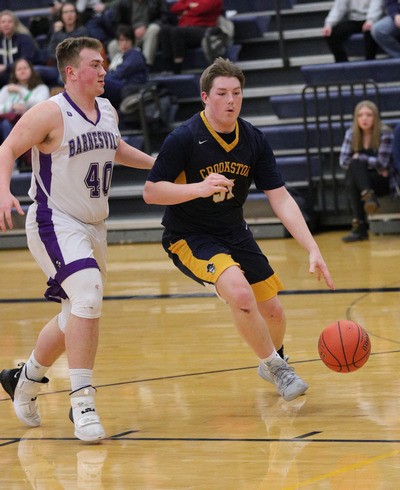 Crookston took a 3-2 lead in the first three minutes of the game with a Carter Bruggeman free throw and a Walker Winjum basket. Barnesville took over with a 10-0 run over the next three minutes with two free throws from Adam Tonsfeldt, back-to-back three-pointers from Jack Neilson and Matt Samuelson, and a basket from Neilson for a 12-3 lead. “We turned the ball over too many times,” said Pirate Coach Greg Garmen. “It wasn’t the start we were looking for, that is for sure.” Crookston stopped the run with an Easton Tangquist three-pointer, but Barnesville answered with another Samuelson three-pointer. Barnesville led 15-8 and went on a 7-2 run to build a 22-10 lead and continued to slowly build on their lead and took a 39-20 lead into halftime. “