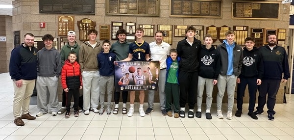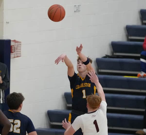 The Crookston Pirate Boys Basketball team played a solid game, and Reggie Winjum scored the 1,000th point of his career on a three-pointer in the first half to lead his team with a total of 37 points in the game as they pulled away for a 71-57 victory over the Fosston Greyhounds at the Crookston High School gymnasium.