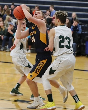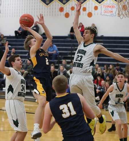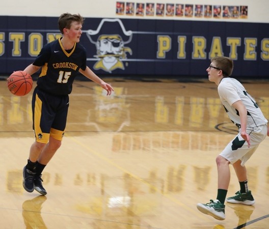 BGMR’s speed and outstanding hustle was a big advantage early as they used their quickness to drive by Crookston defenders combined with surgical like precision on their passing to take a 9-0 lead a few minutes into the game. “That set the tone. We turned the ball over right away and it was an up hill battle the rest of the way,” said Pirate Coach Greg Garmen. “We told the guys it is a Monday night game and they had to be ready to compete. BGMR shot the ball well and they defend well and they are athletes, they are ballers and they go.” The Gators continued their domination and led 29-6 with 10 minutes left in the half. Trailing 37-10, Crookston had their only run of the half when Easton Tangquist made two free throws and the Pirates got the ball back and Tangquist made a three-pointer for a 5-0 run to get his team within a 37-15 deficit with 5:29 left in the half. BGMR continued their domination the rest of the half and took a 50-17 lead into halftime. “Our message at halftime was we needed to shore it up being down by 33,” said Coach Garmen. “We needed to chip away and get some stops.”