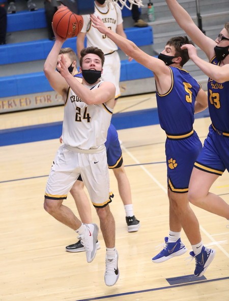 Crookston had a good start with Easton Tangquist making a three-pointer and after a TRF basket, he made a running shot through the lane and the Pirates led 5-2 over three minutes into the game. The Prowlers responded with two baskets in the paint and two free throws to take an 8-5 lead. Crookston’s Tangquist responded with a basket for his seventh point of the game to bring his team within an 8-7 deficit with 12:33 left in the half. Thief River Falls used their stellar 2-3 zone defense combined with their quickness and length to shut down Crookston for the next 8:22 of the game while outscoring the Pirates 11-0 for a 19-7 lead with 4:11 left in the game. “We tried to go inside and couldn’t draw a foul. When we did get to the free throw line we didn’t shoot them very well,” said Pirate Coach Greg Garmen. “We struggled offensively and got into some foul trouble and had to go to the bench. We struggle when our starters are on the bench.” Crookston stopped the run with a Brooks Butt free throw and after a TRF basket, Tangquist added a free throw but the Prowlers ended the half on a 12-0 run and took a 33-9 lead into halftime.