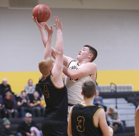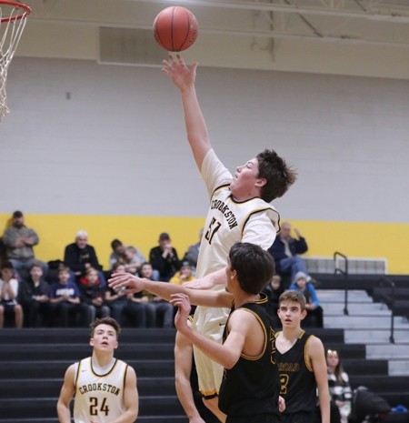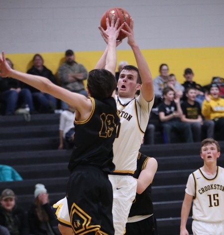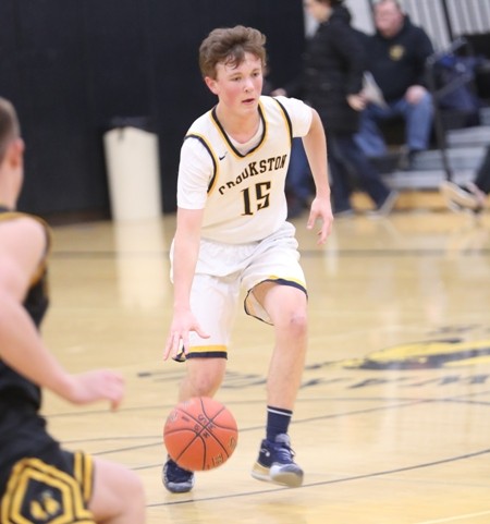 Crookston jumped out to a 4-0 lead with back-to-back baskets from Easton Tangquist, the second basket coming off a nice pass from Carter Bruggeman.  “We came out with a lot of energy,” said Pirate Coach Greg Garmen. “We need to come out with a lot of energy in all our games.” Warroad stopped the run when Virgil Laznicka scored, but Crookston quickly countered with a Bruggeman basket for a 6-2 lead. The teams exchanged baskets, and Crookston led 10-7 when Jack Garmen rattled home a three-pointer, and Caden Osborn scored in the paint for a 15-7 lead five minutes into the game. In a reoccurring theme throughout the game, Warroad came back with five straight points. In another reoccurring theme in the game, Crookston answered with a run of their own when Osborn grabbed an offensive rebound and scored while getting fouled and converted a three-point play. Bruggeman added two free throws, and Crookston led 20-12 with 10:11 left in the game. Warroad battled back to get within a 21-18 deficit, but Crookston pulled away again with two more Bruggeman free throws, a Garmen three-pointer, and a Bruggeman three-point play for a 29-18 lead with less than four minutes to go in the half. Warroad finished the final four minutes on an 11-3 run, and Crookston took a 32-29 lead into halftime.  “We had Caden on the bench with two fouls, and we struggled a little bit at the end of the half,” said Coach Garmen. “We are getting used to playing without Caden because of foul trouble, and Brady Butt and Joseph Ramirez filled in nice, and that was great to see.”