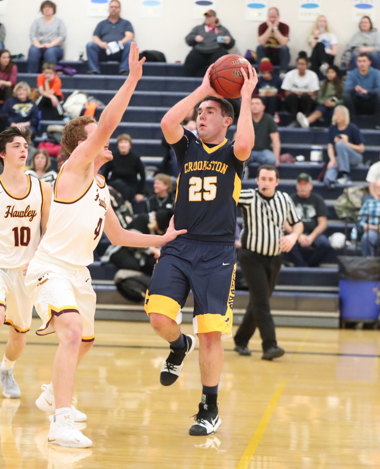 Crookston got off to a fast start at the offensive end thanks to four first-half three-pointers from Nick Garmen. After Hawley scored the games first points with a lay-up off an offensive rebound, Garmen answered at the other end with a three-pointer off an assist from Caden Osborn giving the Pirates a 3-2 lead. Hawley responded with four-straight points before Osborn set up Garmen for another triple tying the game at 6-6. The Nuggets scored four-straight points again, but this time Osborn connected from deep bring Crookston back within one. Jaden Lubarski kicked a pass into the corner for Nick Garmen on the Pirates next possession where he buried his third three-pointer giving Crookston a 12-10 lead. Hawley countered with two-straight baskets to claim a 14-12 lead, but a Brady Butt offensive rebound and put-back lay-up tied the game at 14-14. Trailing 16-14, Nick Garmen made his fourth three-pointer of the half giving the Pirates a 17-16 lead before Walker Winjum connected on a shot beyond the arc giving Crookston a 20-16 lead. “We got out and pushed the ball up the floor and found open shooters,” said Crookston head coach Greg Garmen. “Our shooters were hitting, but I’d say we shot the ball better in the first half than the second.” The Nuggets tied the game at 20-20, and both sides traded baskets to 36-36 after a Josh Bernia three-pointer tied the game going into the final minutes of the first half. Hawley closed the half on a 6-0 run capped off by a Jacob Vetter offensive rebound and lay-up giving the Nuggets a 42-36 halftime lead. “We had the turnover at the half,” said Garmen of Hawley’s close to the half. “We were going for one shot and had the turnover and then the foul so they’re shooting a free throw. We give up the free throw box out, and that’s something we’ve struggled with all year. We’ve got to clean that up as well because if we don’t, it’s going to be tough.”