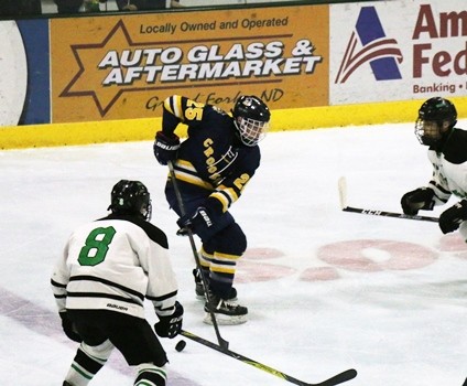 The Green Wave kept rolling in the second period, and it started with 14:13 to go when Schultz found Emery, who’d score to make it 4-0. Pirates goaltender Noah Dragseth played well over the next 10 minutes to keep the score 4-0, but the constant pressure by East Grand Forks would prove to be too much as with 4:37 left in the period Mason Poolman took a pass from Panzer and put the green wave up 5-0. Two minutes later, Parker would get his fourth of the night, making it 6-0. Right off the faceoff, the Green Wave was back on the offensive as it took just 24 seconds for Poolman to get his second goal and make it 7-0. The Pirates would get a powerplay, and their lone goal of the game when a mass of bodies hit the ice in front of the net, and Quinn Westlake scored from his knees to make it 7-1 with 48 seconds left in the period. “It was a big week for Quinn, and he works his tail off,” said Hardy. “And that’s a credit to his parents. He has great parents. We talk about this group of seniors being down and how good these kids are, but the thing is, we have eight seniors and eight sets of parents who are done. In my seven years hear we have great groups of parents. I’m going to miss this group of seniors.” However, 24 seconds later, the Green Wave would score again when Panzer fired a shot off the goaltenders stick and into the net for an 8-1 lead. “We talked before the period that we had to push the first six to nine minutes,” said Hardy. “But things fell apart there at the end of the period. It was disappointing, and I think the guys saw the writing on the wall.” The Green Wave outshot the Pirates 30-3 in the second period.