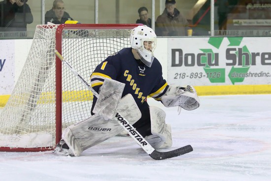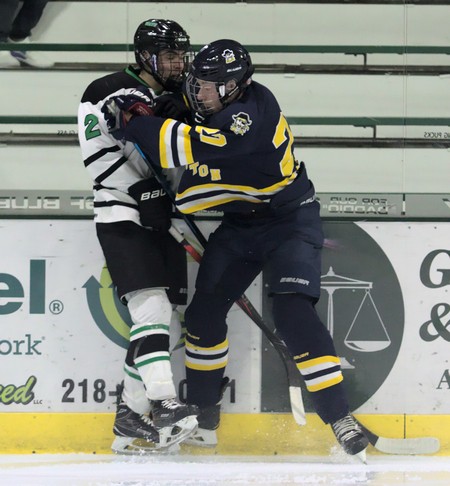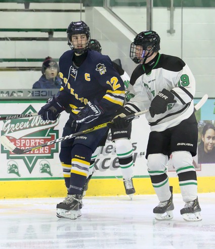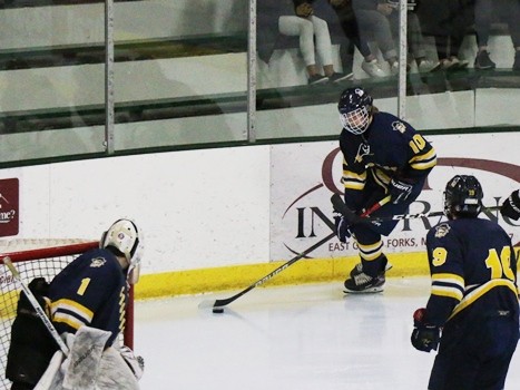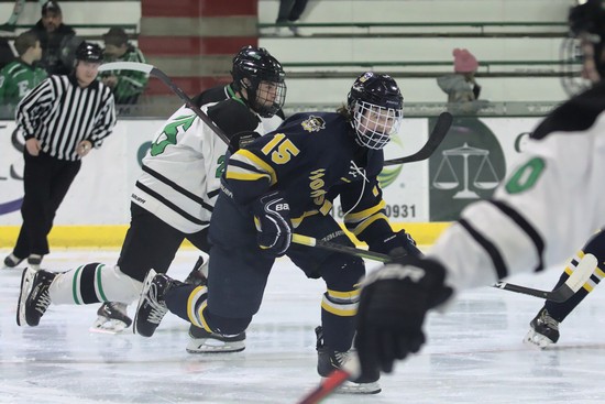 The Pirates got off to a nice start to this Section 8A quarterfinal winning three of the first five faceoffs and registering the first shot on goal. But the Green Wave were able to strike first and take command when Nathaniel Emery centered a puck to Brody Schultz, who slid it down the top left corner of the crease for Landon Parker, who backhanded it for a 1-0 lead with 14:17 left in the period. Parker would make it 2-0 just 55 seconds later when Jackson Panzer carried in two-on-one and got the puck to Parker in front for his second of the night. The Pirates would get a powerplay midway through the period but were unable to sustain pressure before committing a penalty of their own late in the period. The Green Wave cycled the puck nicely on the powerplay but were unable to score. However, just after the penalty ended, Parker picked up a loose puck at the bottom of the right circle and wired a wrist shot through five skaters under the crossbar for the hat trick and a 3-0 lead. “That’s a backbreaker,” said Hardy. “The first goal was a beautiful goal which as a beautiful tic-tac-toe play. After that, I thought we were good, pressured them, had some chances while playing the game we needed to play. But then that third one was a backbreaker. Going in, we know if we give up three goals, we’re likely not coming back, and that’s a tough pill to swallow.” East Grand Forks outshot the Pirates 17-4 in the first.