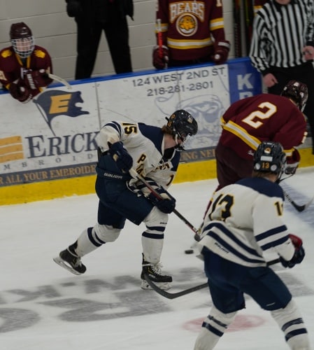 The game started at a slow pace with only a few shots on goal. Crookston would eventually get a Power Play opportunity but would come up empty with one shot on goal. Shortly after the Power Play, Alex Longoria would have a breakaway for Crookston, make a nice move, but hit the post to leave the score tied at 0-0. “We’ve talked about how we are such a momentum team and if we don’t get a bounce or a goal early we’re in trouble,” said Pirates Head Coach Josh Hardy. “We need to build that confidence early and that was a tough bounce. I know Alex (Longoria) was frustrated with that one and he also had a couple of other good chances tonight but just couldn’t find the back of the net.” With just under seven minutes remaining in the period, all the momentum flipped to Lake of The Woods, and they started controlling the puck consistently and getting good shots on net. They finally broke through with just over three minutes remaining in the period and took a 1-0 lead on a wristshot from the middle of the ice. It took no more than two minutes after that for the Bears to strike again on a transition opportunity, and just like that, Crookston was facing a 2-0 deficit late in the first period. Neither team would get a shot opportunity the rest of the period, and the teams would skate to the locker rooms with the Bears in front 2-0. Crookston was outshot in the first period 12-9.