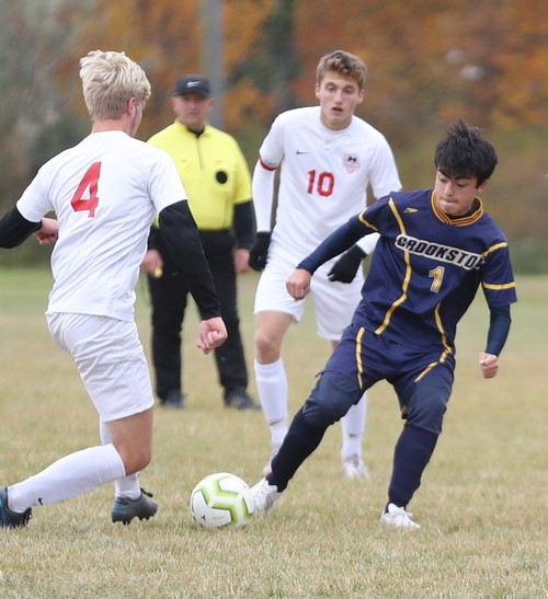 Going into a stiff northwest wind, Red River got on the board early with a goal from senior Mo Dorudian, who got an assist from junior Gannon Brooks. The Roughriders led 1-0 at the 7:35 mark, but the Pirates’ defense held the Roughriders scoreless for the next 24 minutes. “We had a nice span there in the first half where we played pretty good defense,” Crookston head coach Lon Boike said. “Of course, (Red River) got a couple of goals in a short span there, and pumped up the lead a bit. But, going against a quality team like this, I thought our guys played well.” Despite a long, scoreless stretch, the Roughriders pounded the Pirate defense late in the first half with three goals in a 5.5 minute span, putting Red River ahead 4-0 at halftime.