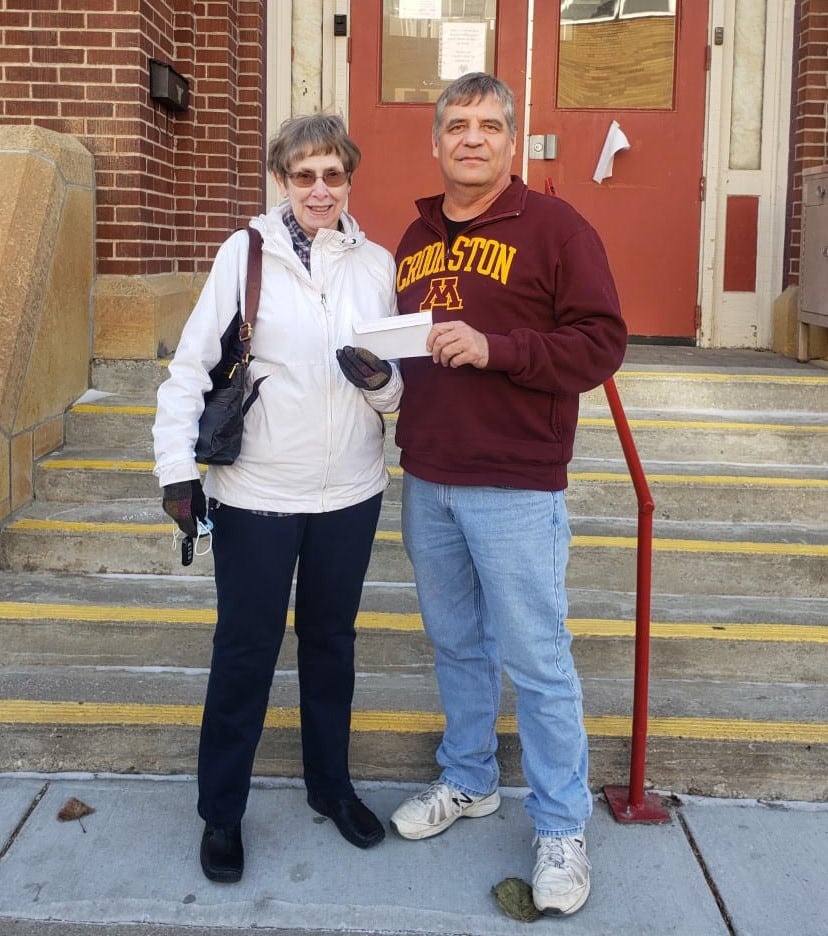 Pictured below is Marlys Finkenbinder (Presbyterian Women’s Association) presenting the checks to Brian Halos (Crookston Care and Share Executive Director).