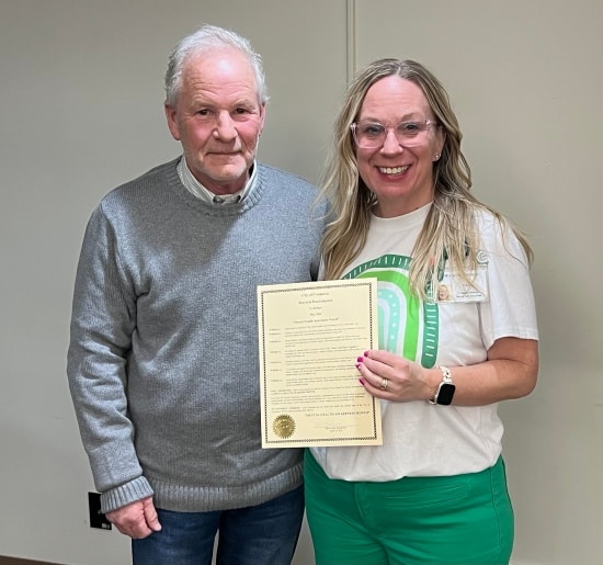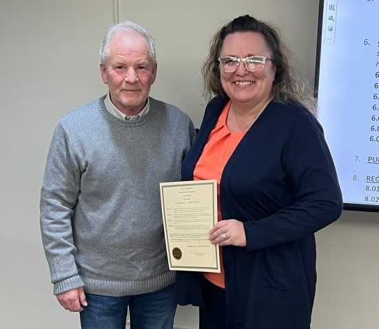 The meeting started with two Mayoral Proclamations for Mental Health Awareness Month and Community Action Month, honoring Tri-Valley Opportunity Council for serving over 2,000 families and over 4,500 individuals annually. The mental health proclamation was presented to Cindy Strom of RiverView Health, and the Community Action Month proclamation was presented to Melody Heddon of Tri-Valley.