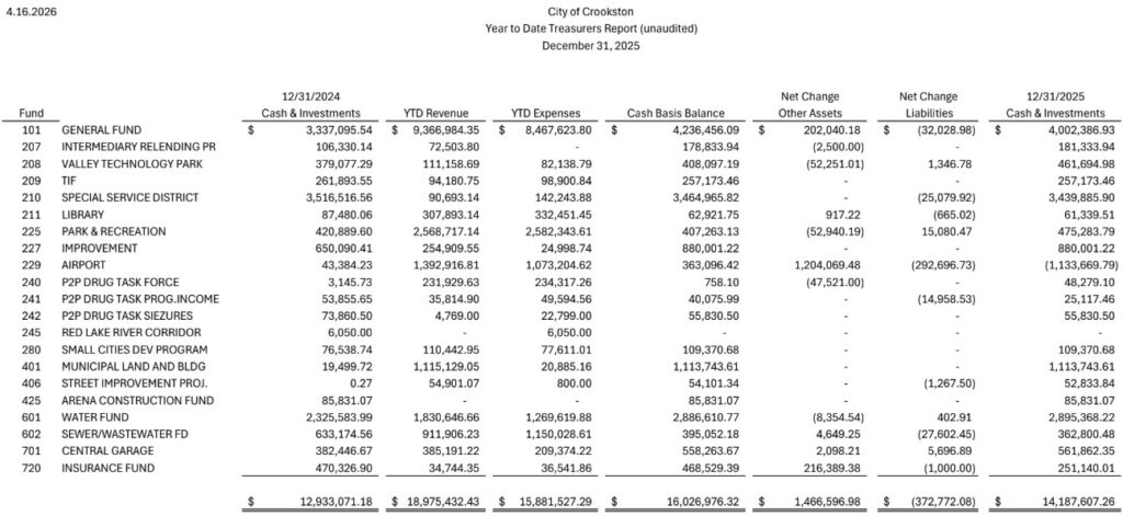 During the staff report portion of the meeting, City of Crookston Finance Director Jon Roscoe gave the council a Financial update (see the numbers at the end of the story) on the numbers as of December 31, 2025. The good news was the City’s finances seem to be a little better than expected. “The council members were kind of wondering what the total city funds are in the bank, essentially what they can utilize in each fund, the reserves, where they’re at,” said Roscoe. “Are the reserves finally going back up? So that was a big thing. To put a little bit back away in 2025 after the reserves have decreased for the previous couple of years.”