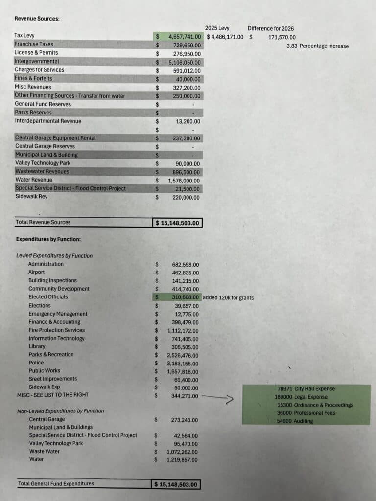 The Crookston City Council held another budget workshop meeting on Monday evening at Crookston City Hall’s council chambers. After a lengthy discussion that lasted about two hours, the council proposed an eight percent increase in the preliminary levy for 2026. The final levy can’t exceed eight percent when it is decided in December, but it can go lower. The state requires cities, counties, and school districts to have their preliminary levy in by 11:59 p.m. on September 30 each year. “Tonight, we decided to look at a proposed levy of 8%. Again, that gives us time to reduce any additional reductions or cuts to try to reduce that number,” said Interim City Administrator Darin Selzler. “But again, as we all know, we can never go up; we can always go down. And that gives us a little buffer to go back to the drawing board, work on these budgets, and try to reduce some expenditures.