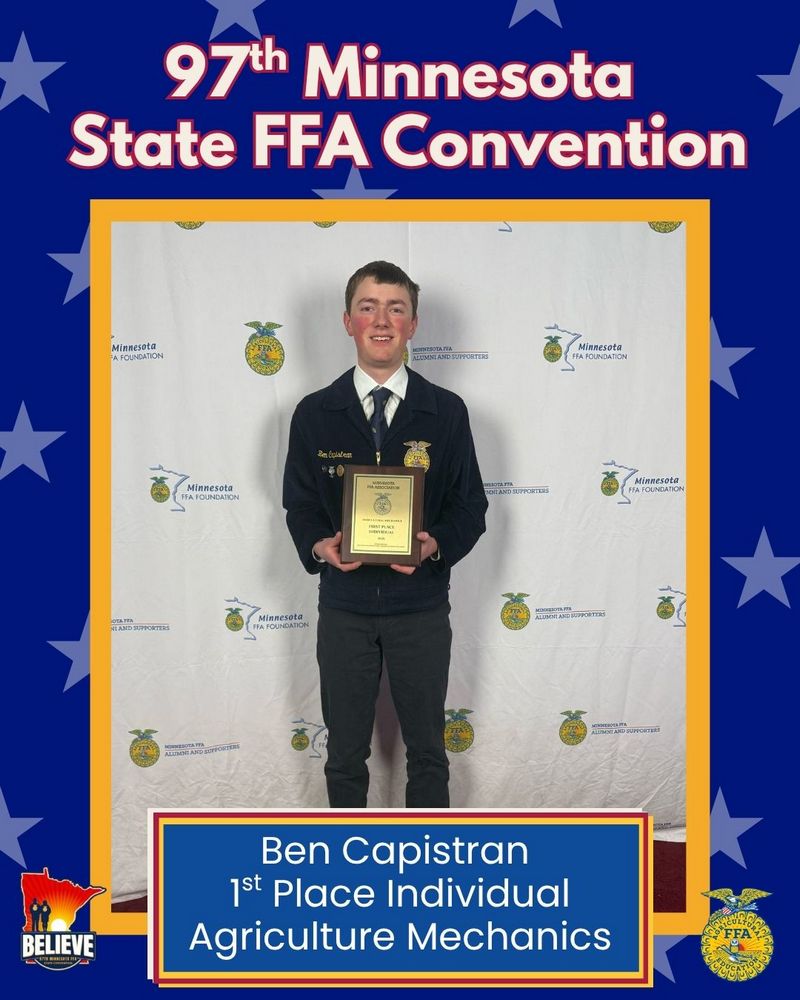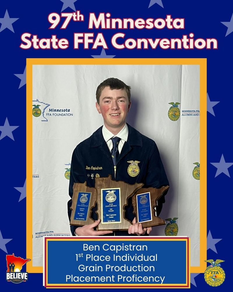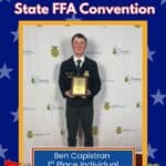 Ben Capistran was named the state Proficiency winner in Grain Production Placement, which will advance to nationals later this year. Ben was also named the state runner-up in both Fiber/Oil Crops Production Entrepreneurship and Specialty Crop Production Placement.