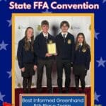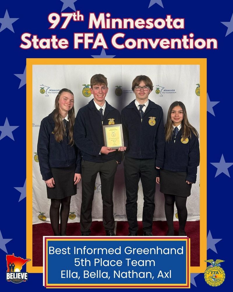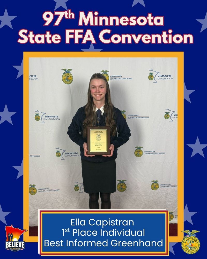 The Best Informed Greenhand team placed 5th in the state competition (out of 69 teams) and ranked gold. Ella Capistran captured the title of 1st place Individual Best Informed Greenhand (out of 352 competitors). Bella Cisneros, Nathan Pahlen, and Axl Page ranked gold; Emmagail Frantz, Molly Workman, Haddie Halland, Anna Heldstab, and Eva Gosse ranked silver.