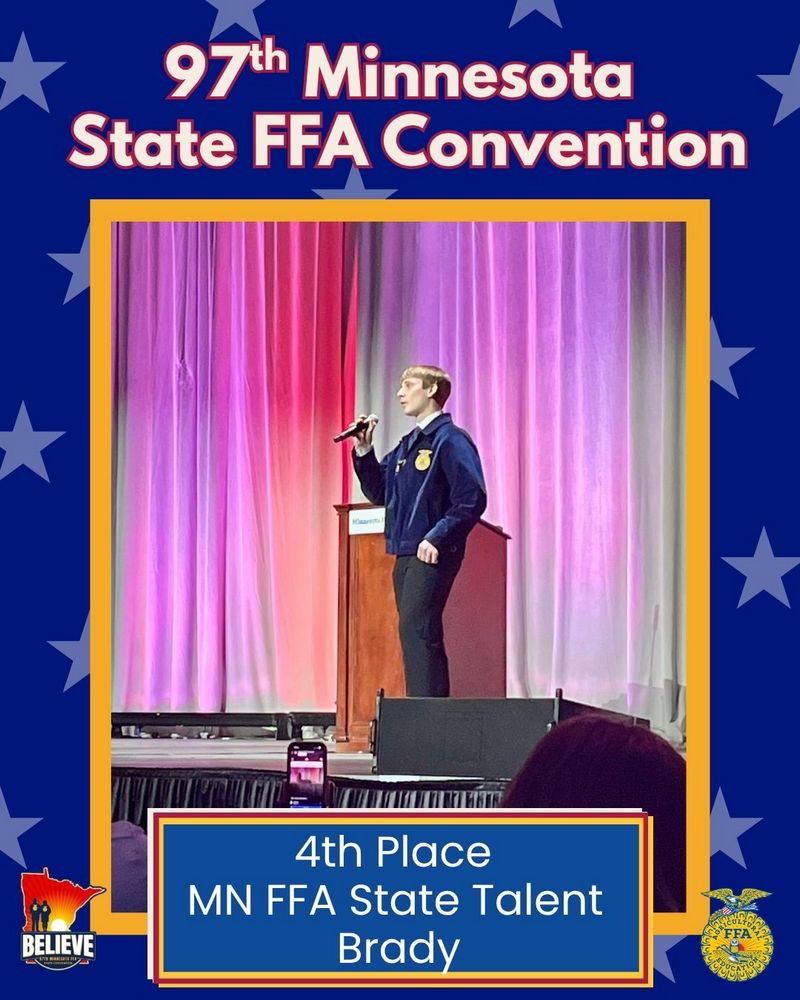 Brady Samuelson placed 4th (out of 15) FFA members in the Talent contest, ranking gold. He was given the chance to sing on stage in front of over 3,000 Minnesota FFA members and guests.