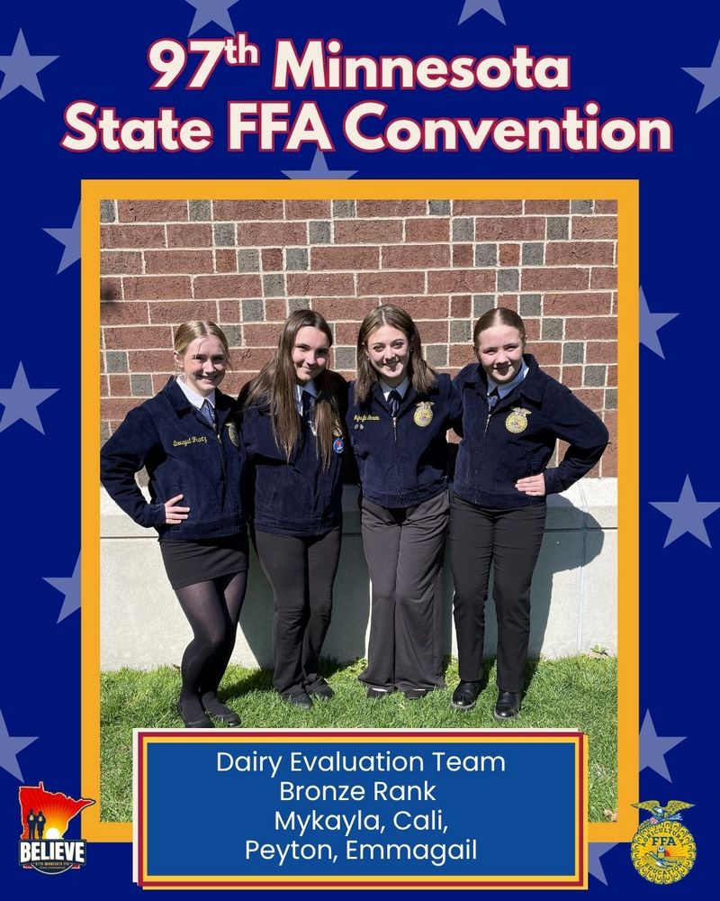 The Dairy Evaluation team placed 53rd (out of 60 teams) and was ranked bronze. The team was made up of Mykayla Garcia, Emmagail Frantz, Calianna Donarski, and Peyton Krenzel, all ranking bronze.
