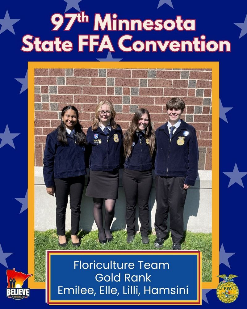 The Floriculture team placed 14th (out of 46 teams) and ranked gold. The team consisted of Lilli Bridgeford, ranking gold, Elle Pierson, Emilee Smith, and Hamsini Chanda, ranking silver.