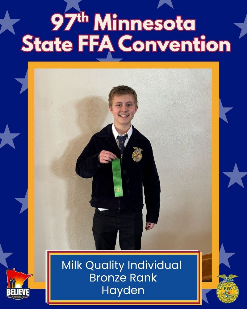Crookston FFA had 1 student qualify and compete in the Milk Quality Contest. Hayden Ricard was individually ranked bronze for his contest.