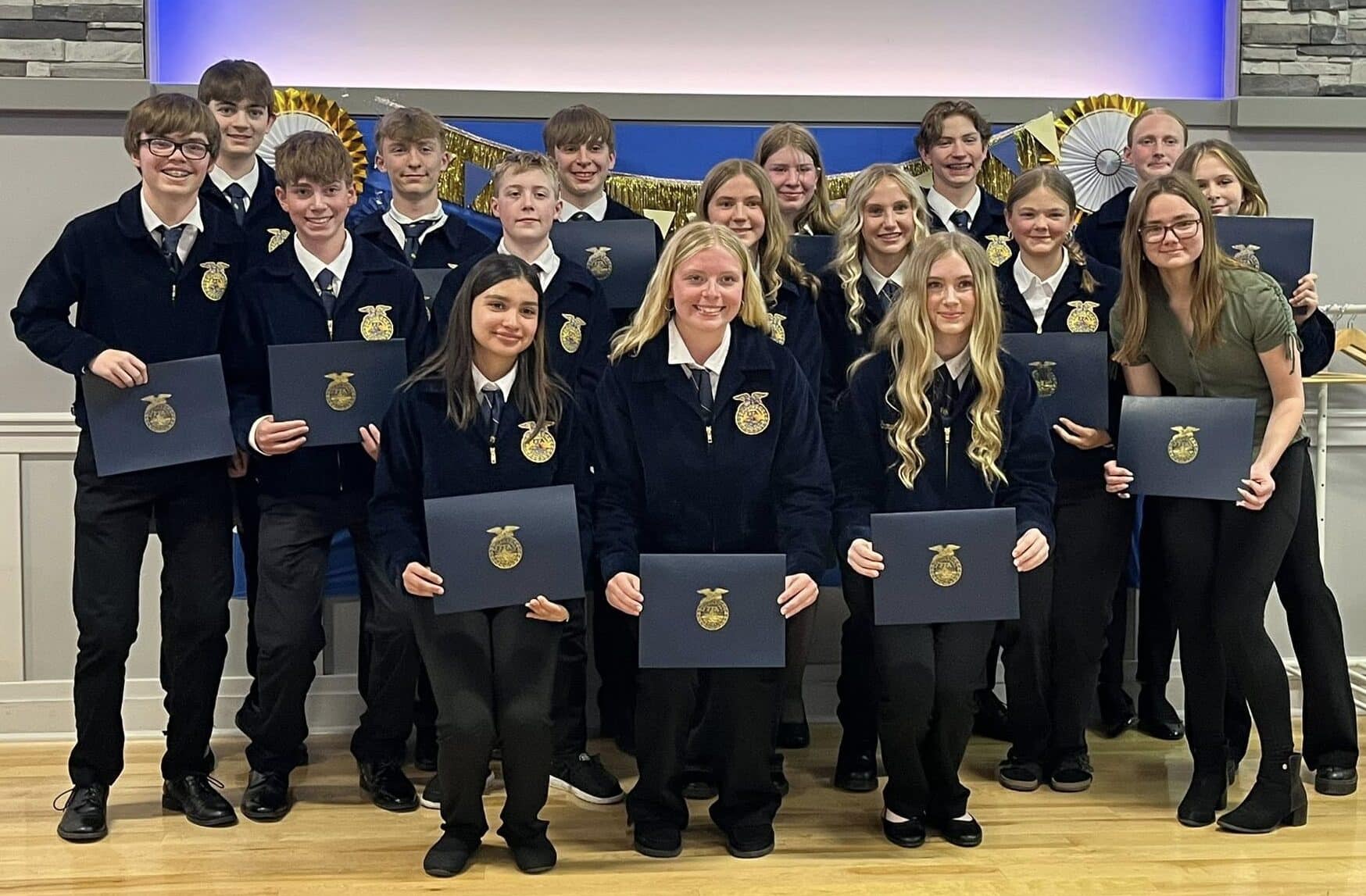 Crookston FFA awarded 14 Chapter Degrees to Isabel Pahlen, Addisyn Schiller, Emilee Smith, Mykayla Garcia, Benjamin Capistran, Leah Johanneck, Elle Pierson, Rylee Anderson, Allysen Wagner, Austin Thode, Dylan Thode, Madilyn Abrams, Connor Hanson, Avery Mathews, and Cade Wisk.
