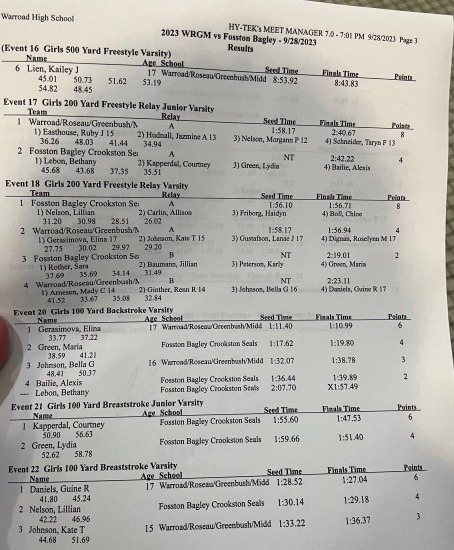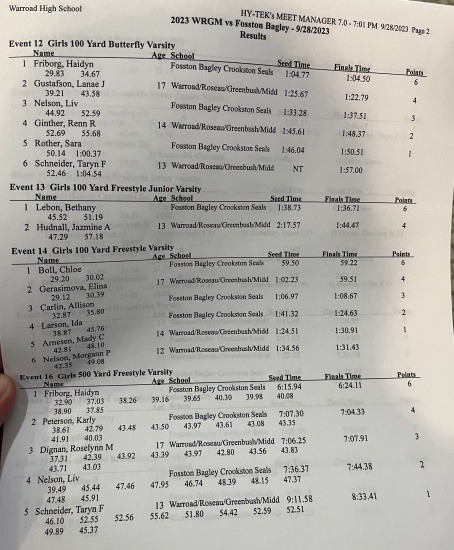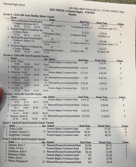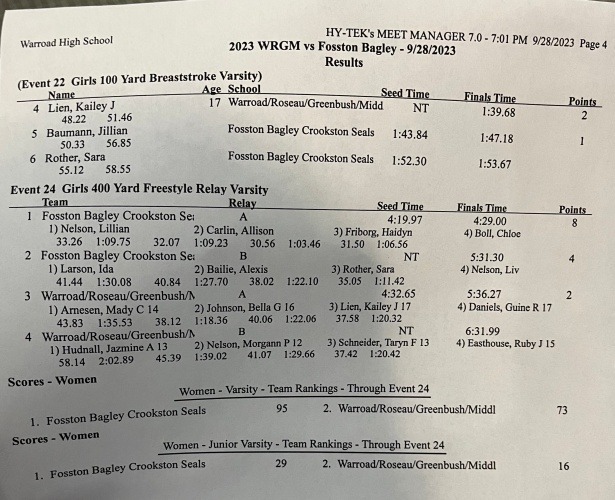 The Crookston/Fosston/Bagley Seal Girls Swim team beat the Roseau/Warroad North 95-73 in a dual at the Warroad High School pool.