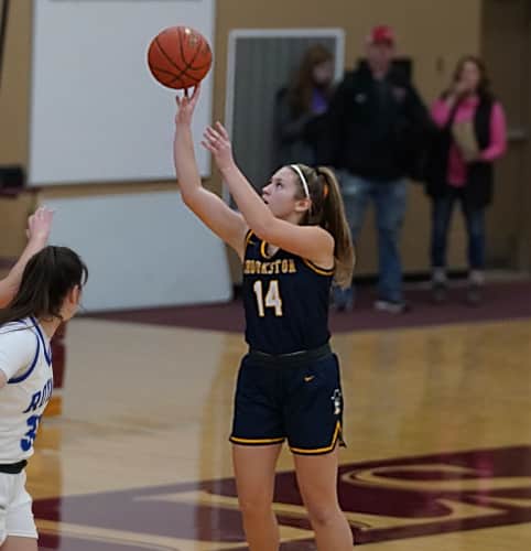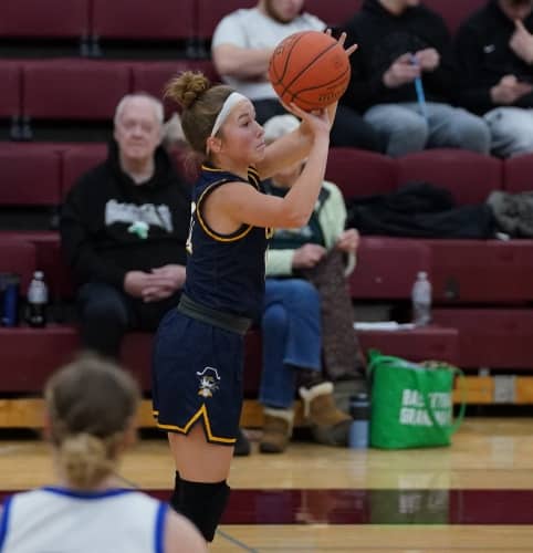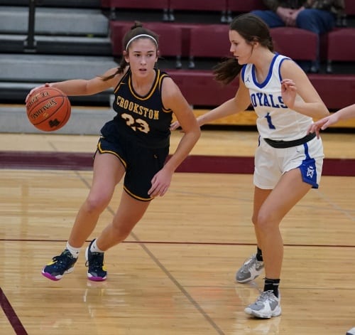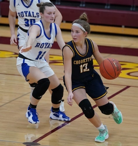 The first half was a back-and-forth battle with Crookston scoring the first points with an Ally Perreault basket, which was countered by a Watertown-Mayer five-point run. Crookston’s Emma Osborn got her team back on track offensively with back-to-back baskets followed by two Halle Winjum free throws to cap a 6-0 run for an 8-5 lead less than four minutes into the game. “Emma keeps getting better each game and she has added to her game this year,” said Coach Zimmerman. “We know she is a great shooter and a smart player, but she has really stepped up her defense this year.” Crookston built an 11-7 lead when Watertown-Mayer made back-to-back three-pointers for a 13-11 lead. Crookston responded with a Hayden Winjum basket to tie the game at 13. The teams were tied at 15 and again at 20 when Crookston went on a 5-0 run behind two points apiece from Libby Salentine and Hayden Winjum, and a free throw from Halle Winjum and the Pirates had a 25-20 lead with 90 seconds left in the half. “That was a big run for us,” said Coach Zimmerman. “That gave us a needed boost before halftime.” The teams exchanged baskets in the final minute with the Royals scoring with 10 seconds left in the half, and Crookston took a 27-24 lead into halftime. “It was a solid first half and I thought we played well on both sides of the floor,” said Coach Zimmerman.
