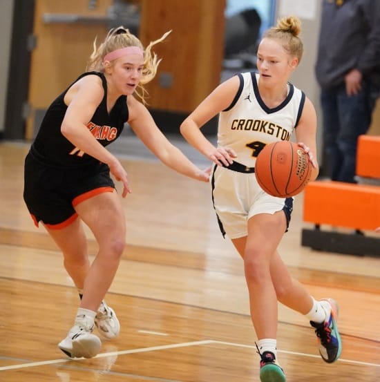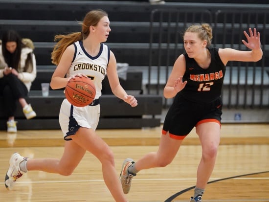 The Crookston Pirate Girls Basketball team used a 16-0 run late in the game to open up a 20-point lead to beat the Menahga Braves 54-39 in a Section 8AA matchup in Menahga.